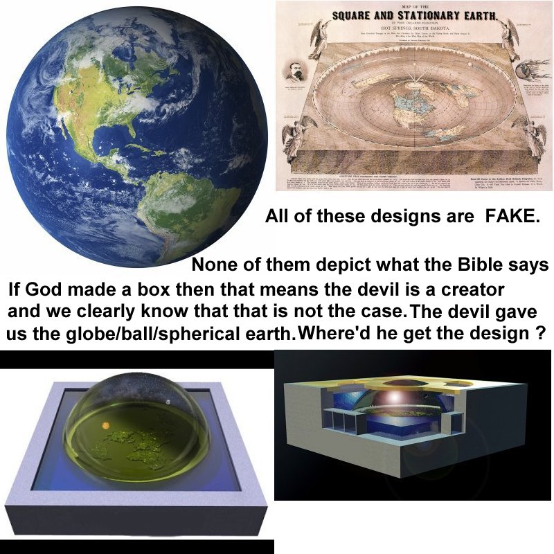As explained in other pages the design is true; it is a water filled ball with a domed firmament flat level earth inside it set upon foundations and elevated by pillars with the Antarctic ice wall acting as a gasket to keep the waters from invading our space. That satisfies the Scriptures about 4 corners as well as those referencing "a footstool", waters above and waters below, the crystal sea, time's encapsulation, and takes into consideration that the devil used this original as his design upon which to stage his lie. It is complete, and leaves no stone unturned.It is in keeping with what Scripture says.